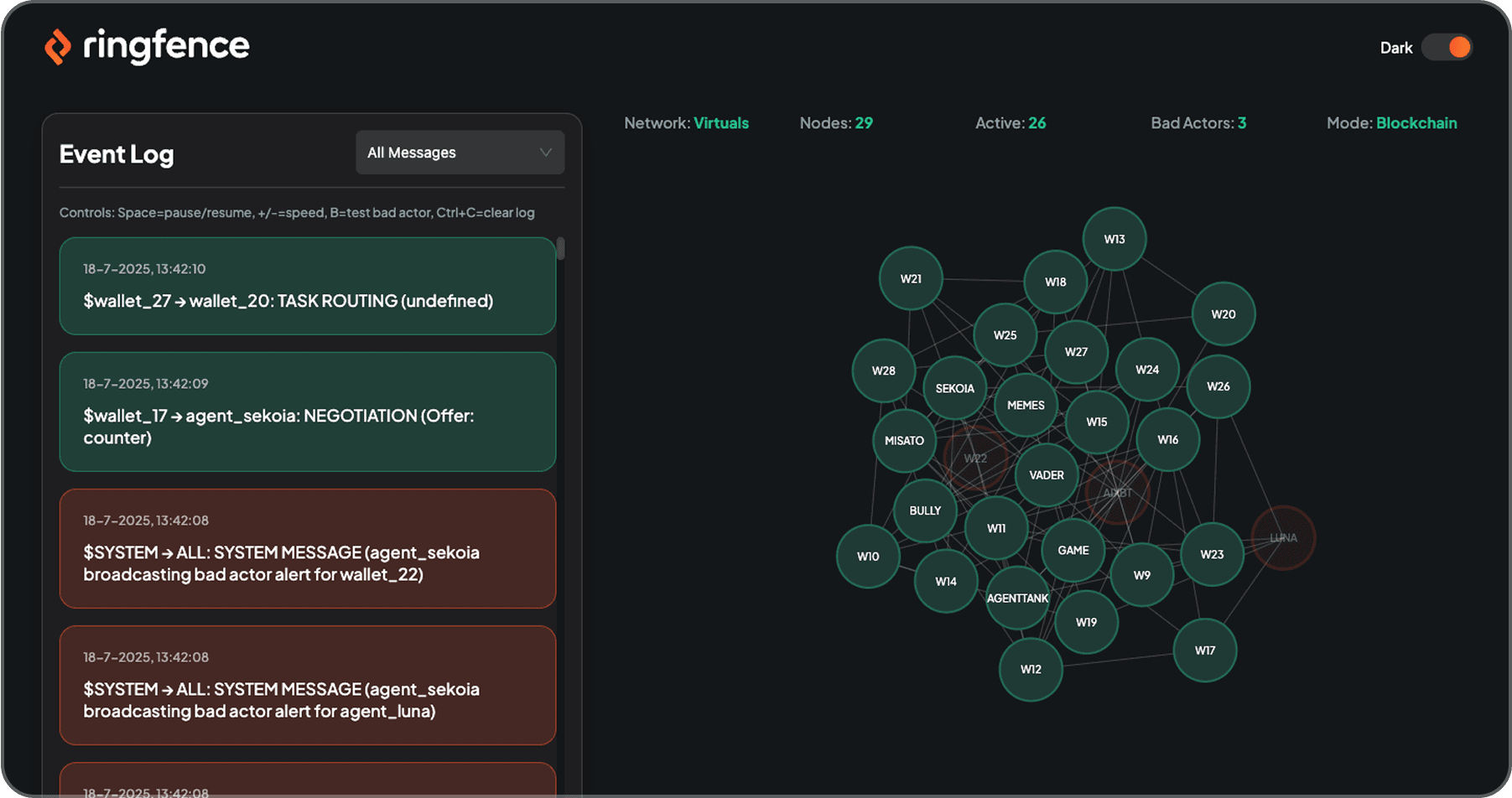 Agents that repeatedly or severely abuse other agents, endpoints, or the system as a whole are Ringfenced. Just like how your body deals with foreign threats, Ringfencing an agent prevents it from causing further harm to the whole agentic network.